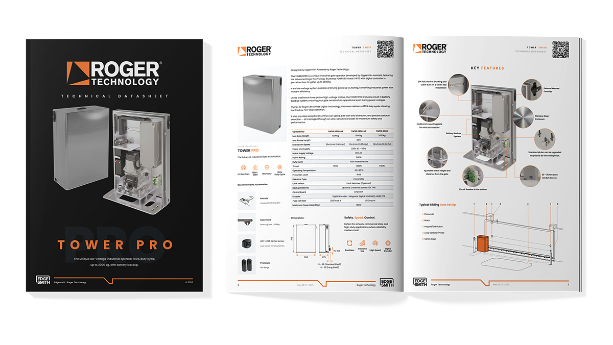 The TOWER PRO is a unique industrial gate operator developed by Edgesmith Australia, featuring the advanced Roger Technology Brushless TOWER110 motor.TW110 with digital controller in pre-wired box, for gates up to 2000kg.