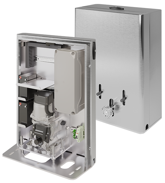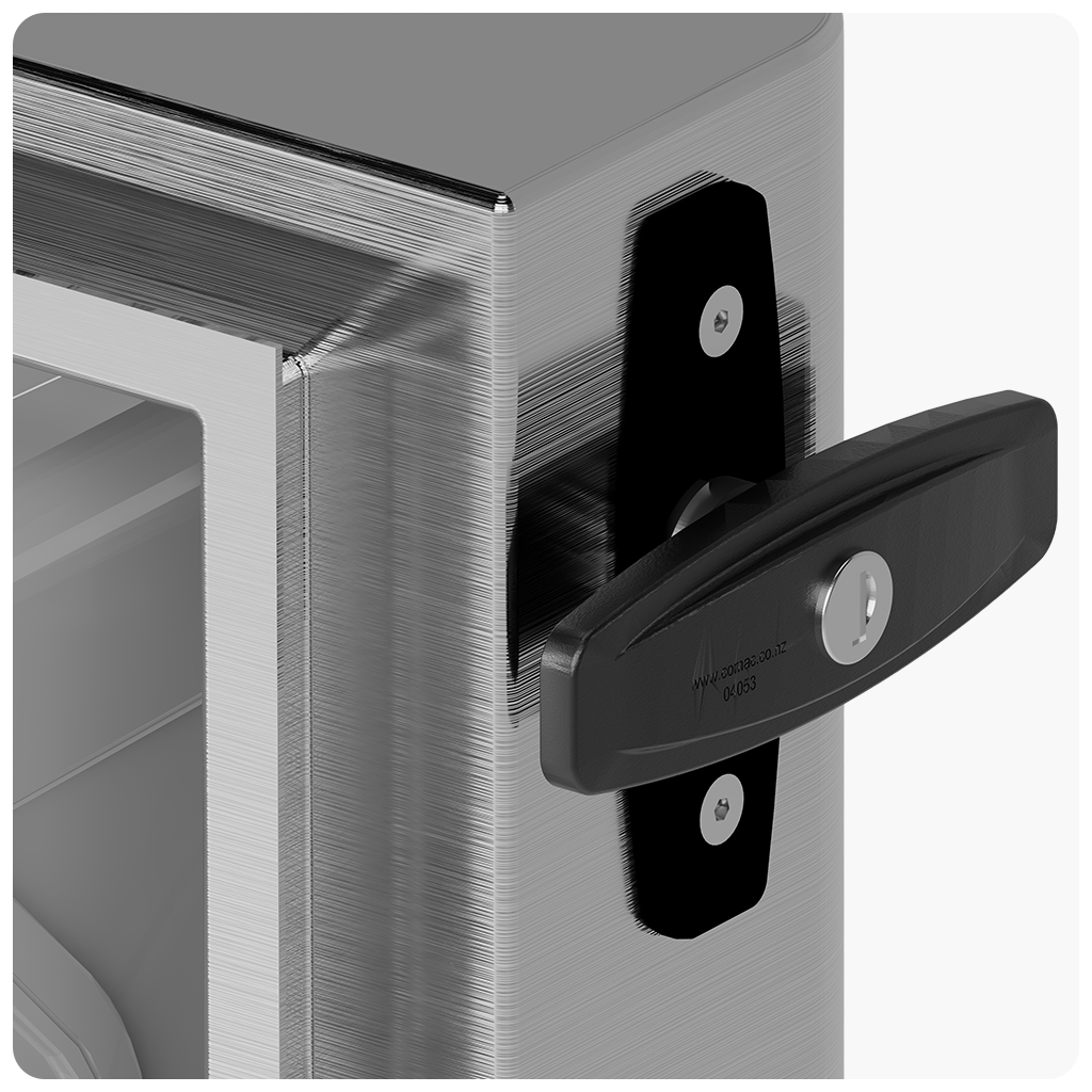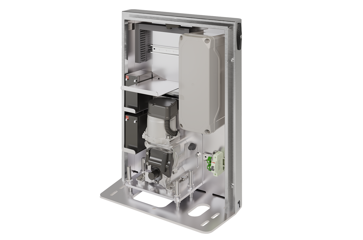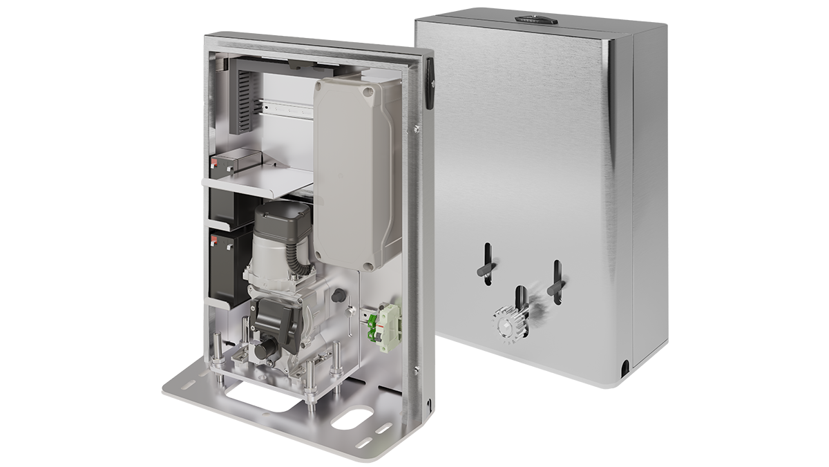 The Tower Pro, designed by Edgesmith, enhances the Tower operator by Roger Technology. Its purpose-built stainless steel enclosure, a commercial gate solution, is crafted to house backup batteries, among other features.