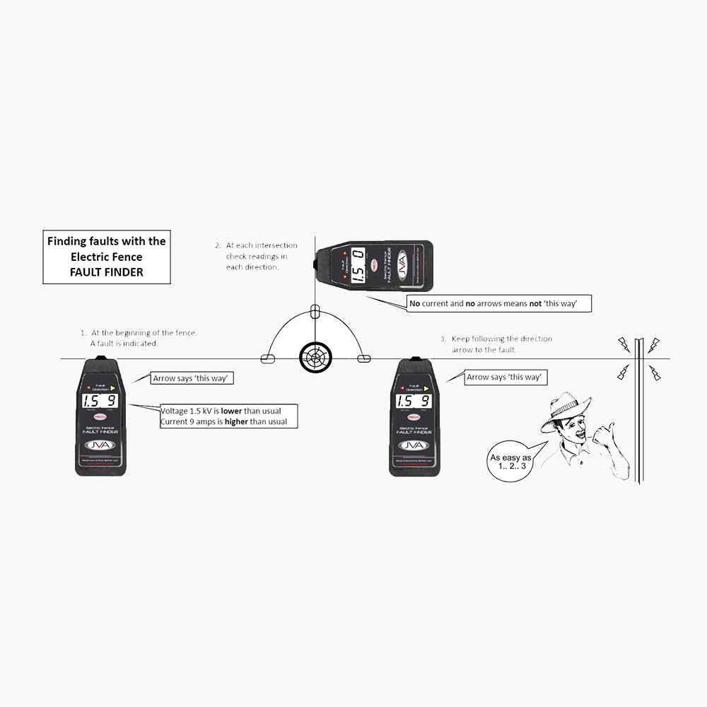 The JVA Electric Fence Fault Finder® makes finding shorts on electric fence as simple as following an arrow.